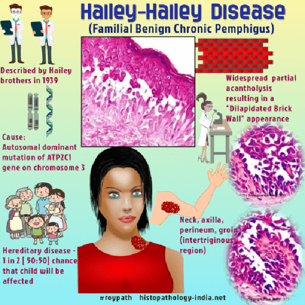 Hailey-Hailey disease is a rare genetic disorder that is characterized by blisters and erosions most often affecting the neck, armpits, skin folds and genitals. Sunlight, heat, sweating and friction often aggravate the disorder. Hailey-Hailey disease is inherited in an autosomal dominant manner, meaning that only one parent needs to have a copy of the defective gene to affect the offspring.